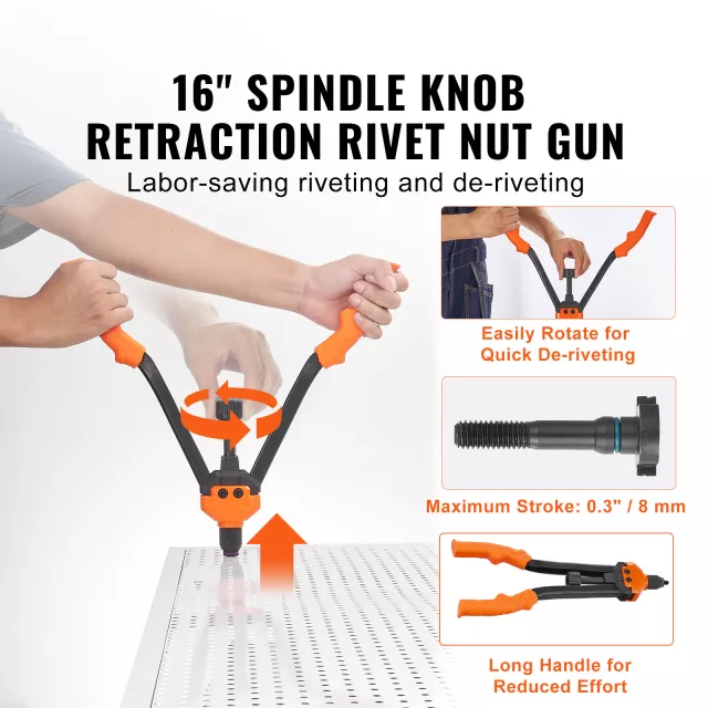 Upgrade your workshop with a powerful, user-friendly rivet nut tool designed to make every fastening task smoother and more efficient. This 16-inch labor-saving rivet nut tool kit delivers the leverage, comfort, and versatility you need, whether you’re working on metal repairs, woodworking, furniture building, automotive projects, or DIY upgrades around the home. With simple operation and a wide range of compatible sizes, it’s the perfect solution for both beginners and experienced makers.