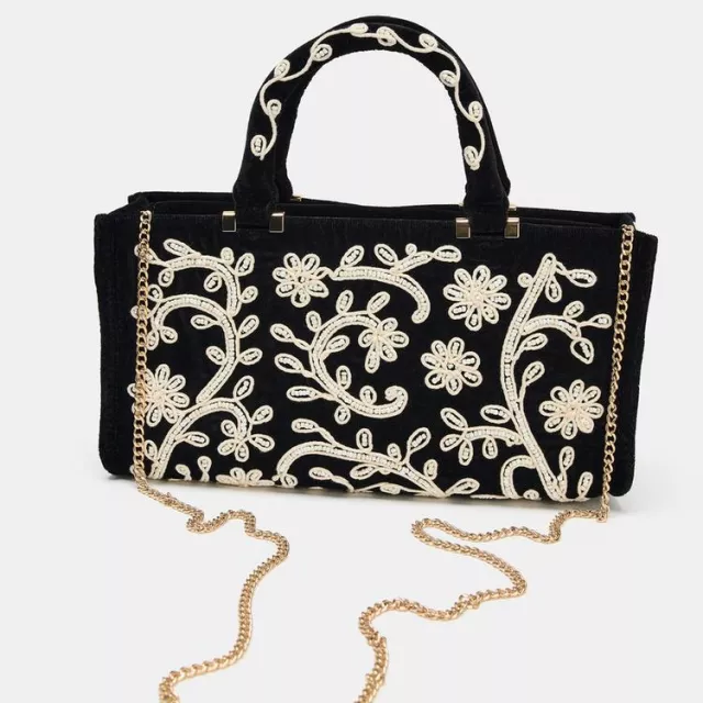 Perfect for versatile use, this floral corduroy handbag complements casual looks, office outfits, and elegant ensembles alike. What makes it truly special is its blend of soft fabric, handcrafted embroidery, refined pearl accents, and a fashion-forward chain strap — all working together to create a bag that stands out effortlessly.