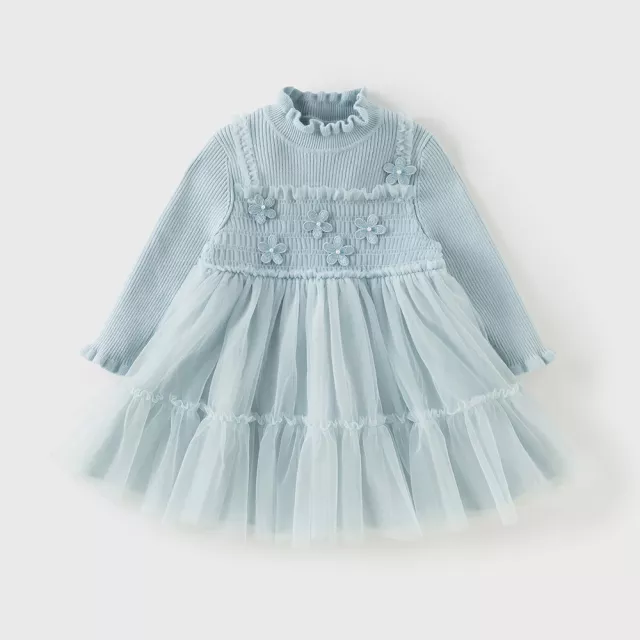 This knee-length A-line dress features a classic crew neck and full sleeves, keeping your child snug during cold weather. The delicate lace overlay and mesh detailing add a dreamy, feminine touch, while the sweet floral accents make it stand out from ordinary kids’ dresses. Whether layered with tights and boots for outdoor wear or worn on its own indoors, this dress brings a blend of cuteness and practicality.