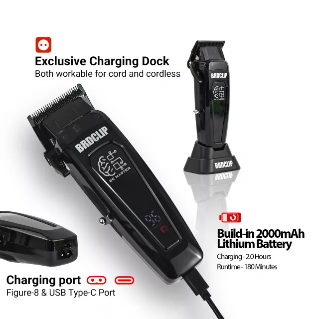 This clipper is engineered to give you consistent power, lower noise, and a smooth cutting feel. The high-torque motor glides through thick, coarse, or fine hair with ease, making it perfect for everyday trims, detailed fading, or complete buzz cuts. Its USB Type-C charging and included dock keep it ready whenever inspiration strikes, while the LED display shows your remaining working time at a glance. The magnetic blade cover offers quick access for cleaning, making hygiene simple and fast.